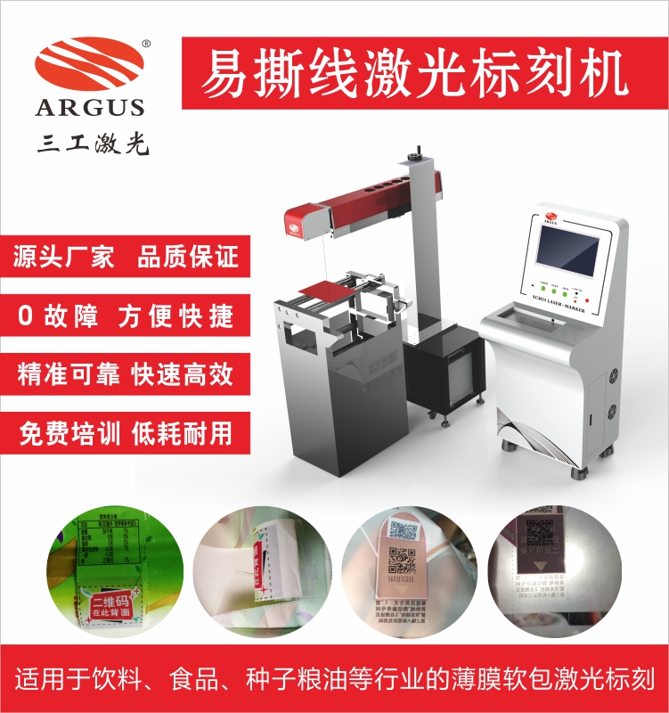 激光標刻易撕線技術(shù)的應用越來越普遍,廣泛的行業(yè)應用促使激光加工技術(shù)飛速發(fā)展,激光刻線在薄膜軟包易撕線加工上的應用也是日新月異,激光加工成為了PE、PVC、PET薄膜加工行業(yè)新型的工藝領(lǐng)導者。武漢三工激光是國內(nèi)率先針對薄膜包裝行業(yè)提出激光代替機械加工工藝的企業(yè),專為薄膜易撕線、定量透氣孔設計,打標速度快,設備易操作,性能穩(wěn)定,使用壽命長等。SCM-55集合了激光技術(shù)、光學技術(shù)、精密機械、電子技術(shù)、計算機軟件技術(shù)以及制冷等學科于一體的高科技產(chǎn)品,與傳統(tǒng)的機械齒輪壓孔相比速度更快,孔徑孔距大小可調(diào)更加均勻,可實現(xiàn)任意方向、形狀,多條易撕線標刻。