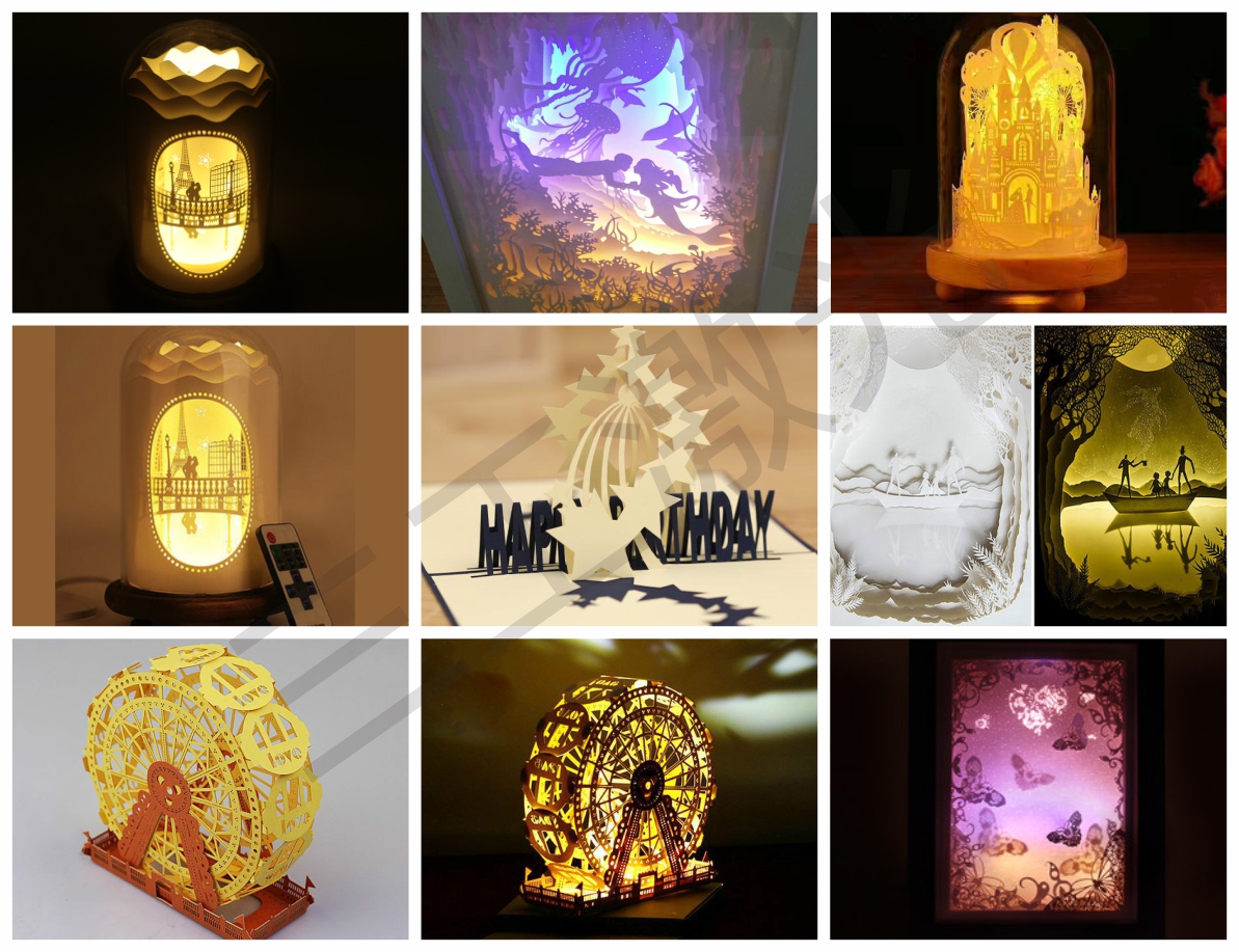 暖暖的燈光透過一層層剪影,呈現(xiàn)出童話里的畫面,匠心獨(dú)運(yùn)的設(shè)計(jì),精心打磨的細(xì)節(jié),做成后燈光柔和溫馨,宛如落日余暉。這種精美的紙雕便是用紙品激光鏤空機(jī)鏤空雕刻而成的,制作完成后也可以通上電源當(dāng)小夜燈使用,美麗而實(shí)用。