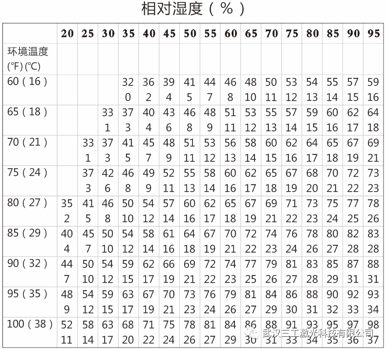 注意:激光器最佳工作水溫為:19℃~25℃,視情況水溫最高可以設(shè)定在28℃,但是在此溫度下,功率可能略有降低。請(qǐng)參考下方環(huán)境溫度和相對(duì)濕度對(duì)應(yīng)的露點(diǎn)溫度。
