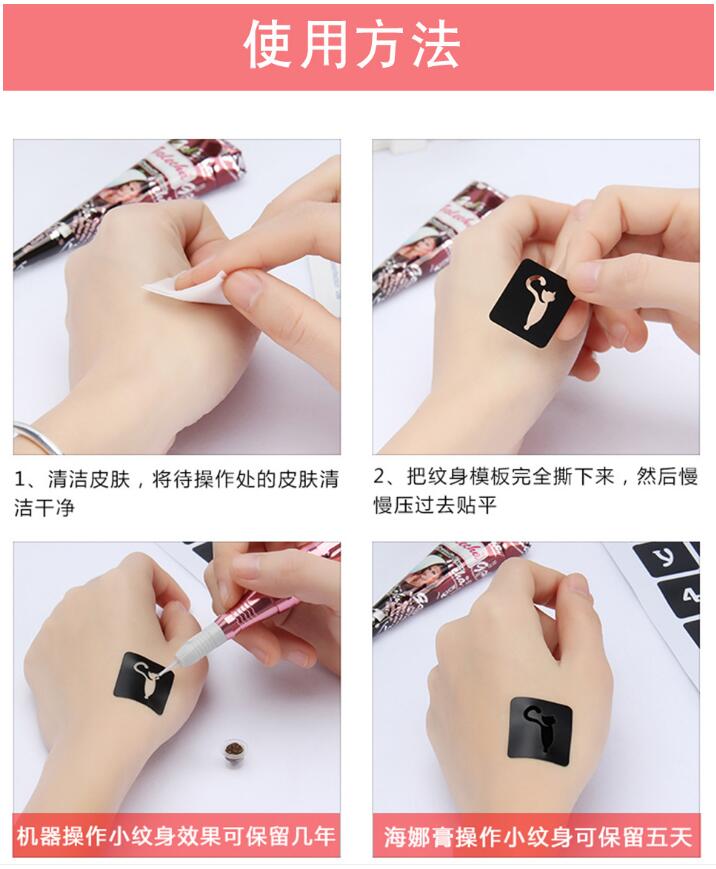 把鏤空紋身模板連同透明保護(hù)膜一起揭起,貼在手背上,輕輕按壓后,撕去透明保護(hù)膜。