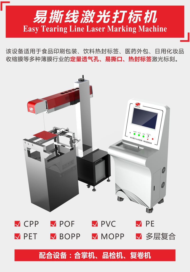激光加工技術(shù)的應(yīng)用越來越廣泛,目前我公司針對塑料薄膜包裝易撕線運(yùn)用激光加工。易撕線激光切割機(jī),可以加工的材料以及行業(yè)非常廣泛,可用于PE、PVC、PET、OPP、塑料、鋁箔 、防靜電/屏蔽袋、抽真空袋、鋁箔面膜、寵物雜糧袋、塑料粒紙鋁塑復(fù)合袋、微孔紋真空袋、建材包裝袋、防潮袋、封口膜等包裝材料的易撕線易撕口的加工,專業(yè)易撕線激光劃線設(shè)備,專為薄膜包裝行業(yè)而生。除此之外還可進(jìn)行熱封標(biāo)簽透氣孔,定量透氣孔的加工!