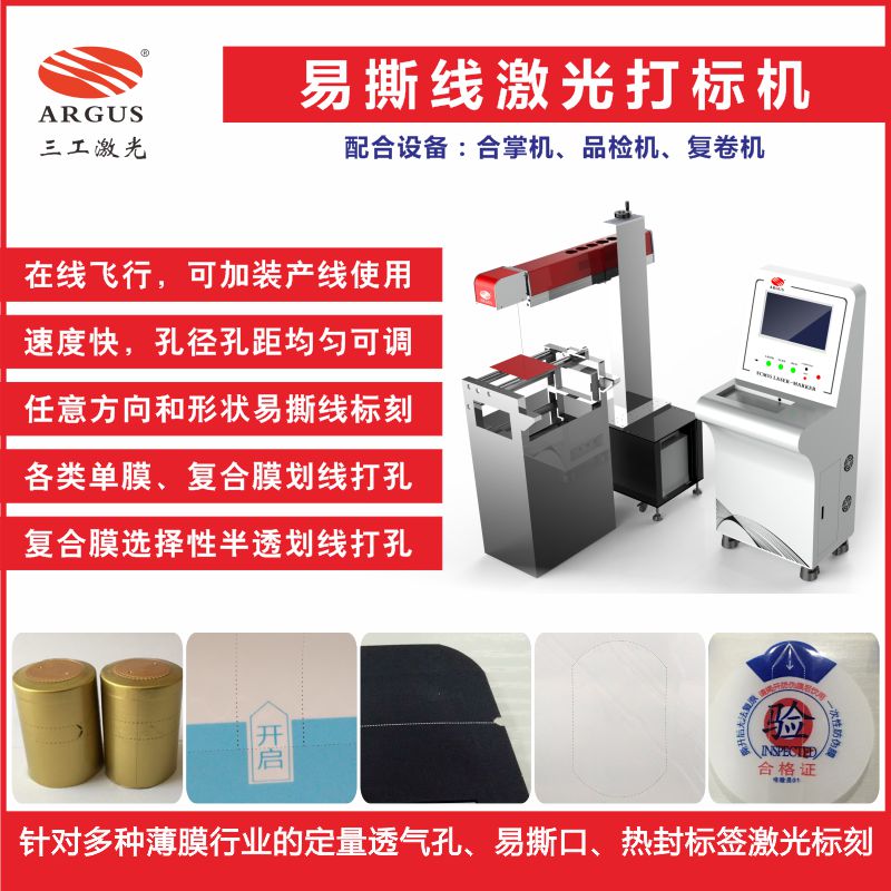 商品包裝或者包裝的表面總是有一層塑料薄膜來保護(hù)商品以免受潮或者污染,為了便于打開,經(jīng)常有設(shè)計(jì)的有易撕口或者虛線孔,這一小小的設(shè)計(jì)給生活帶來了便利。經(jīng)常會看到一些物品采用薄膜軟包,上面有一排小小的透氣孔,例如常見的電子產(chǎn)品充電器上,一層薄薄的軟薄膜,淺淺的一排定量透氣孔。定量透氣孔采用激光打孔,便捷快速,效果好。三工激光定量透氣孔激光打孔機(jī),以其優(yōu)越的加工特性,成為很多商家的選擇。三工激光易撕線激光刻線機(jī)主要用于不同材質(zhì)的塑料包裝袋 ,例如PE、PVC、PET等各種薄膜材質(zhì)。可用于飲品飲料、文化用品、五金工具、日用百貨、電子電器、金屬制品等行業(yè)的定量透氣孔、易撕口、熱封標(biāo)簽等激光標(biāo)刻。