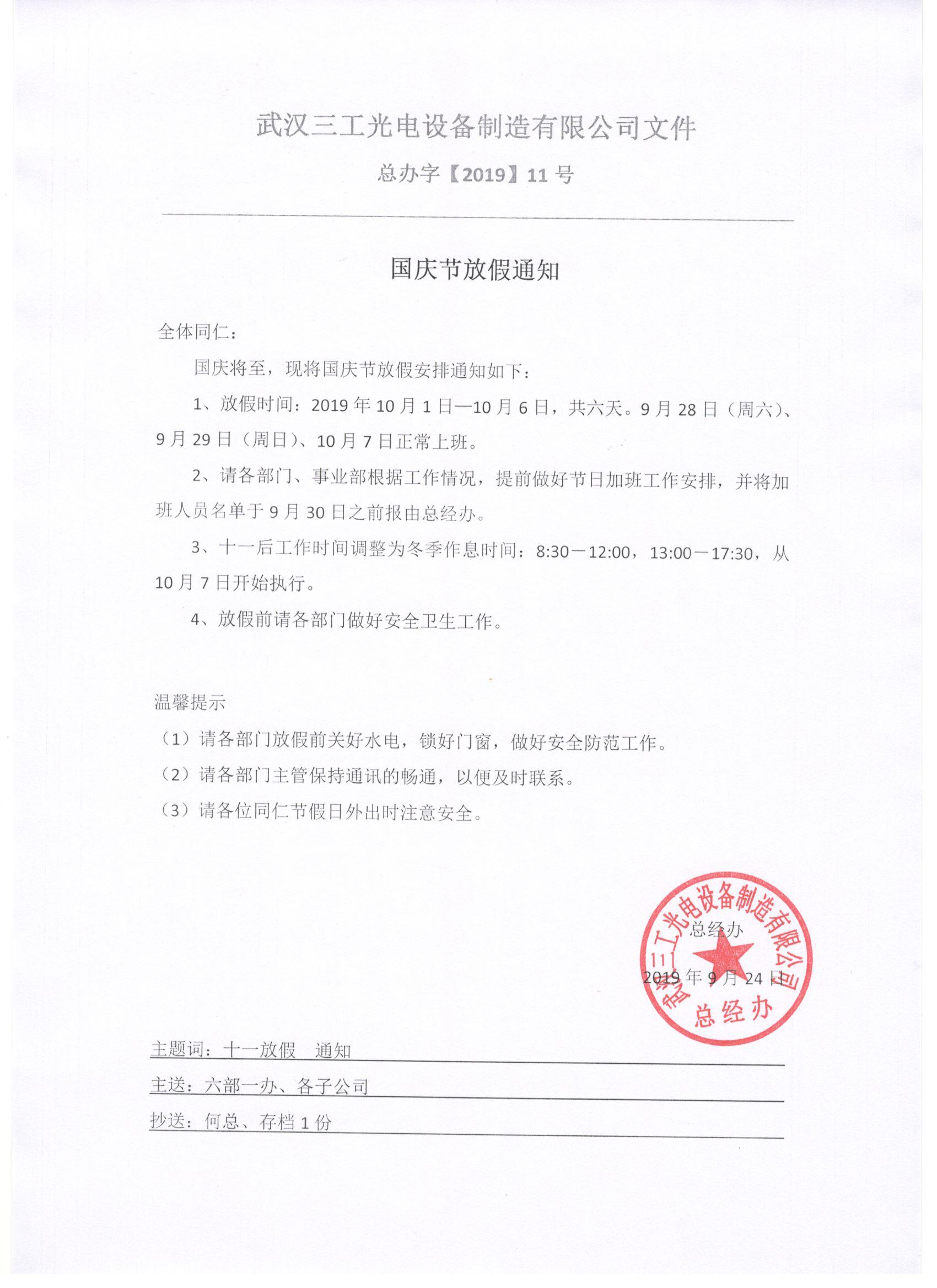 國(guó)慶同歡慶,中秋共團(tuán)圓。值此雙節(jié)來(lái)臨之際,為感謝全體員工的辛勤付出,武漢三工光電.....